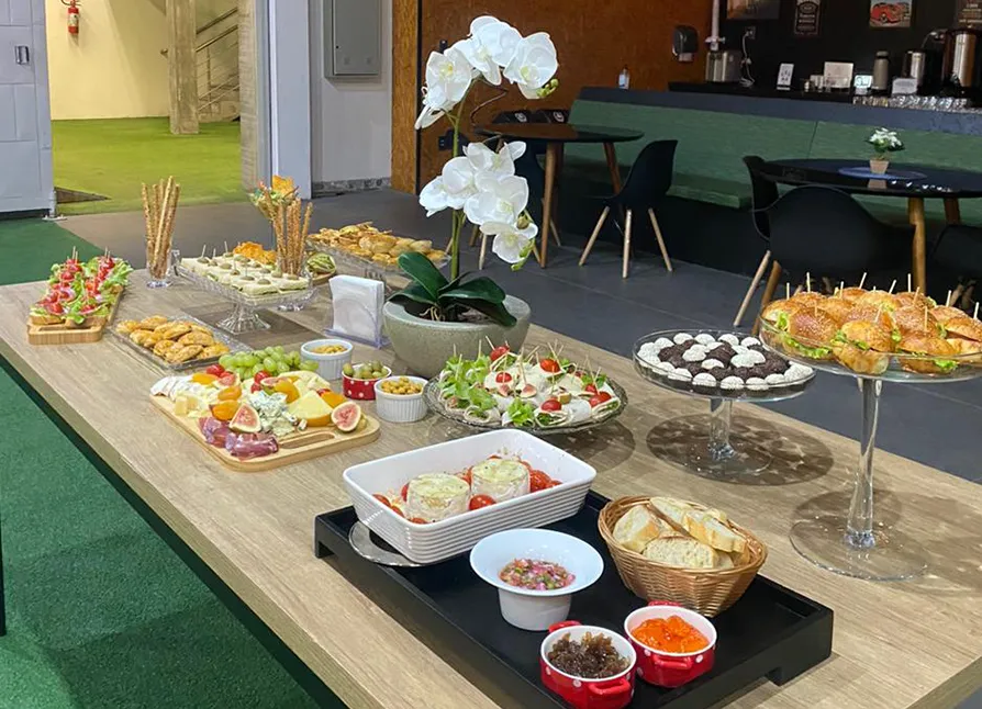 Pausas para café com salgados e doces, comuns em eventos corporativos.